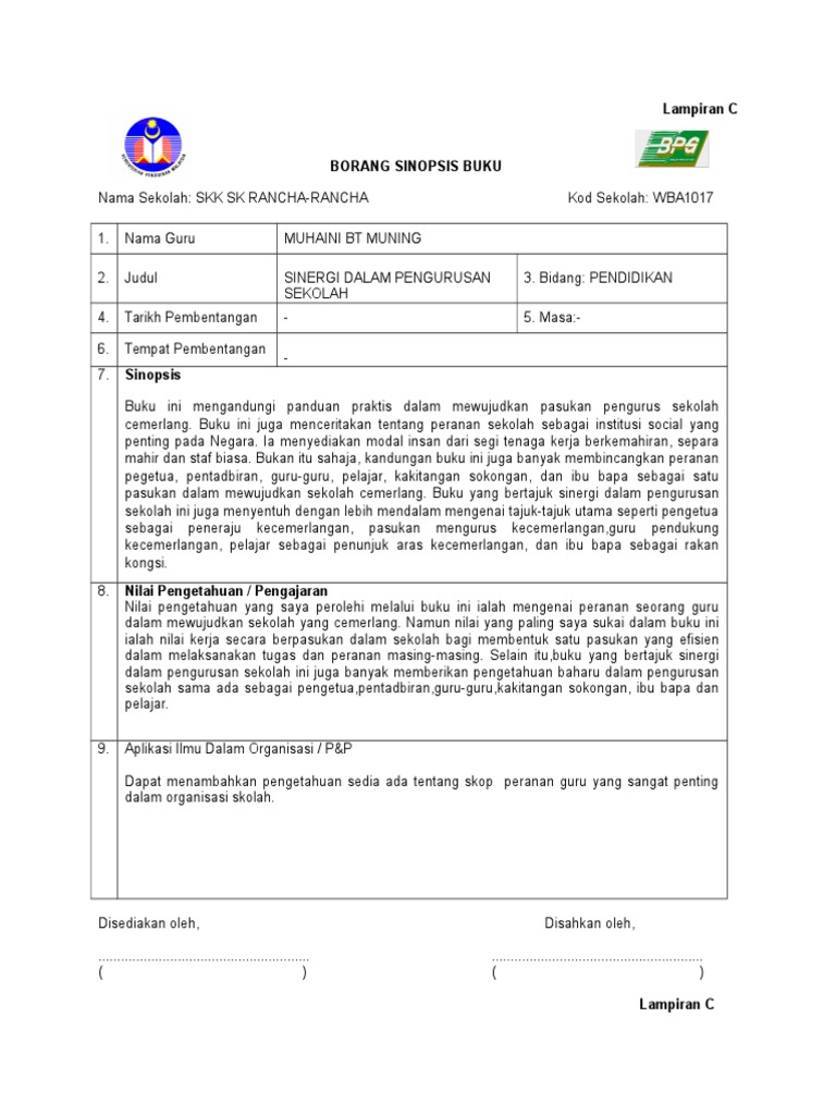 Sebelumnya, kita telah mengetahui beberapa contoh sinopsis dari berbagai jenis karangan, yakni contoh sinopsis novel dan contoh sinopsis antologi cerpen. Sinopsis buku ini mengandungi huraian dan contoh cadangan aktiviti yang boleh dijadikan panduan guru di peringkat sekolah rendah. Biasanya, saat melihat bagian belakang buku, anda dapat menemukan sinopsis singkat. Secara singkat, sebuah resensi dibuat untuk menilai suatu karya dari. Baik itu secara materi di kelas maupun bacaan kelompok sendiri.